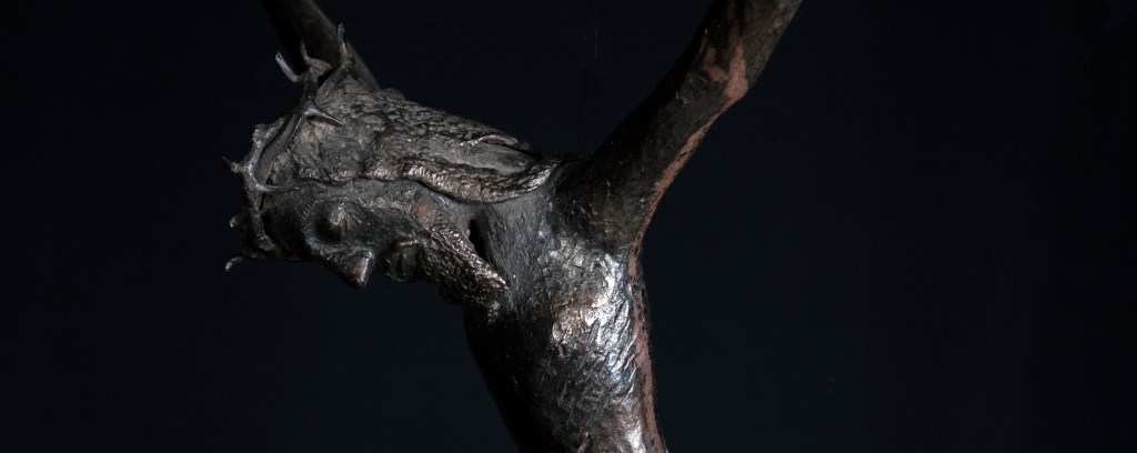 As an image of meditation, whatever transformation this work accomplished for its creator continues in today’s visual reading. The paradox of an almighty God sharing in human suffering by submitting to the full measure of human cruelty in an effort to affect a deeper understanding of the gift of our existence, is a rare story among the peoples of the earth. Regardless of who imagines control of the Christian narrative, the image of Christ’s crucifixion endures for this simple, cross-cultural, boundary-jumping reason: all of us will suffer in life, and yet, it need not consume us. Suffering is present at each person’s birth and walks with us, accompanied by hope and strength, all of our days. If we, like the Christ, find the courage to set aside our protective barriers and see our own face in the experience of others, then we will endure. As the sculpture reveals, occasionally…….it helps to remember our humanness. It helps to personally recognize our shared vulnerability; to gather the strength to reach through the veil of human suffering, and, in so doing, touch at least one hand, so that none may journey through life alone. I can think of no better salve, no better word, and no better image to help heal the loss laid before us.