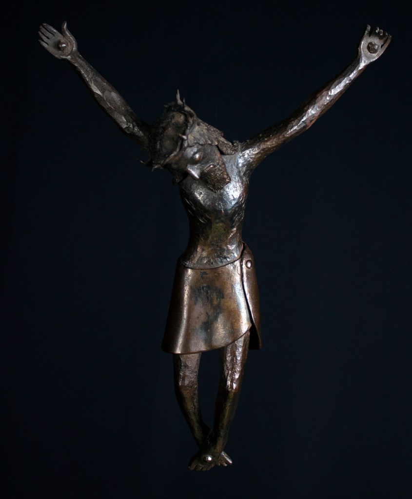 The figure’s rich, burnt umber hue aside, what is most striking about this sculpture is the face. The head is long and crowned with a double-wrapped wreath of thorns. The blacksmith’s focus is to reclaim the moment following Christ’s last breath. With his head turned, falling at a 45-degree angle to the direction of the body, Christ’s suffering has passed. With eyes swollen and closed, the lower lip relaxes. Christ’s hair, matted and looping down and across his shoulders, is delicately tooled. His beard, scraping the middle of his chest, is full and reminiscent of those early scenes of the crucifixion found in Romanesque paintings and sculptures of 11th century. A ubiquitous symbol in Catholic practice, many depictions of the Christ crucified are overly sentimental, mass produced, and given less individual attention than a street sign. This image, however, is not among them. It is a word spoken from the heart. An honest gut-wrenching gasp of faith reverberating like the ping of a hammer striking metal. Through it, the maker is clearly seen to be praying in iron.